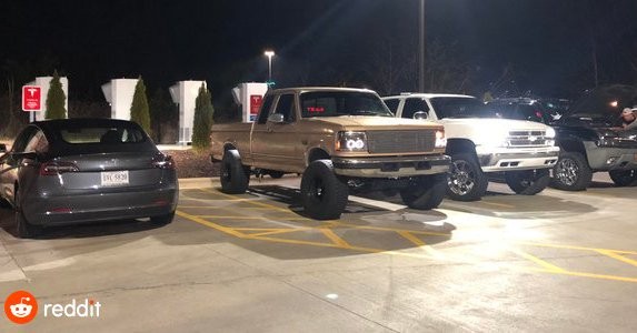 Владелец Tesla и пользователь Reddit Лейцина приехала зарядить свой автомобиль на местной станции зарядки Тесла, расположенной рядом с Sheetz, но все заправочные киоски были заблокированы 3 большими пикапами.